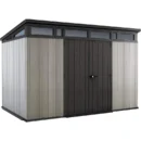 The Keter 11βx 7β² Artisan Heavy Duty Plastic Pent Shed β Grey Β is ideal for storing tall and heavy items due to its high ceilings and integrated heavy-duty resin floor. The Artisan 9Γ7 Shed includes built in high level windows that cover the front and sides of the building to provide natural light into the interior.