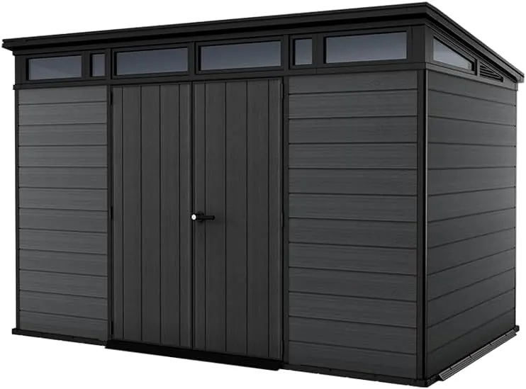 The Keter 11βx 7β² Cortina Heavy Duty Plastic Pent Shed β Dark GreyΒ is modern in every way. With a slanted roof above a band of windows, it boasts a sleek, contemporary design that stores your belongings in eye-catching style. Its double layered walls are made from Evotech, our innovative composite material that gives you the aesthetic look and feel of wood but with the benefits of resin.